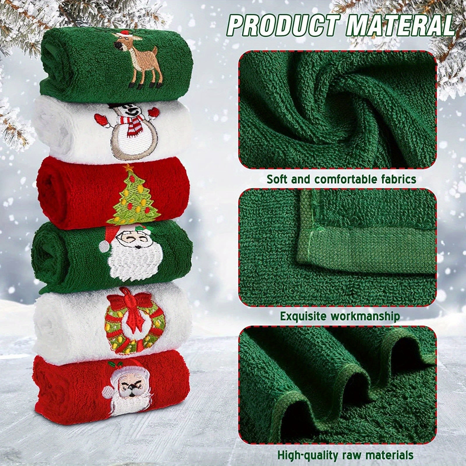 Set of 3 Hand Towels for Christmas Featuring Embroidered Designs of Santa Claus, Reindeer, Snowman and Christmas Tree